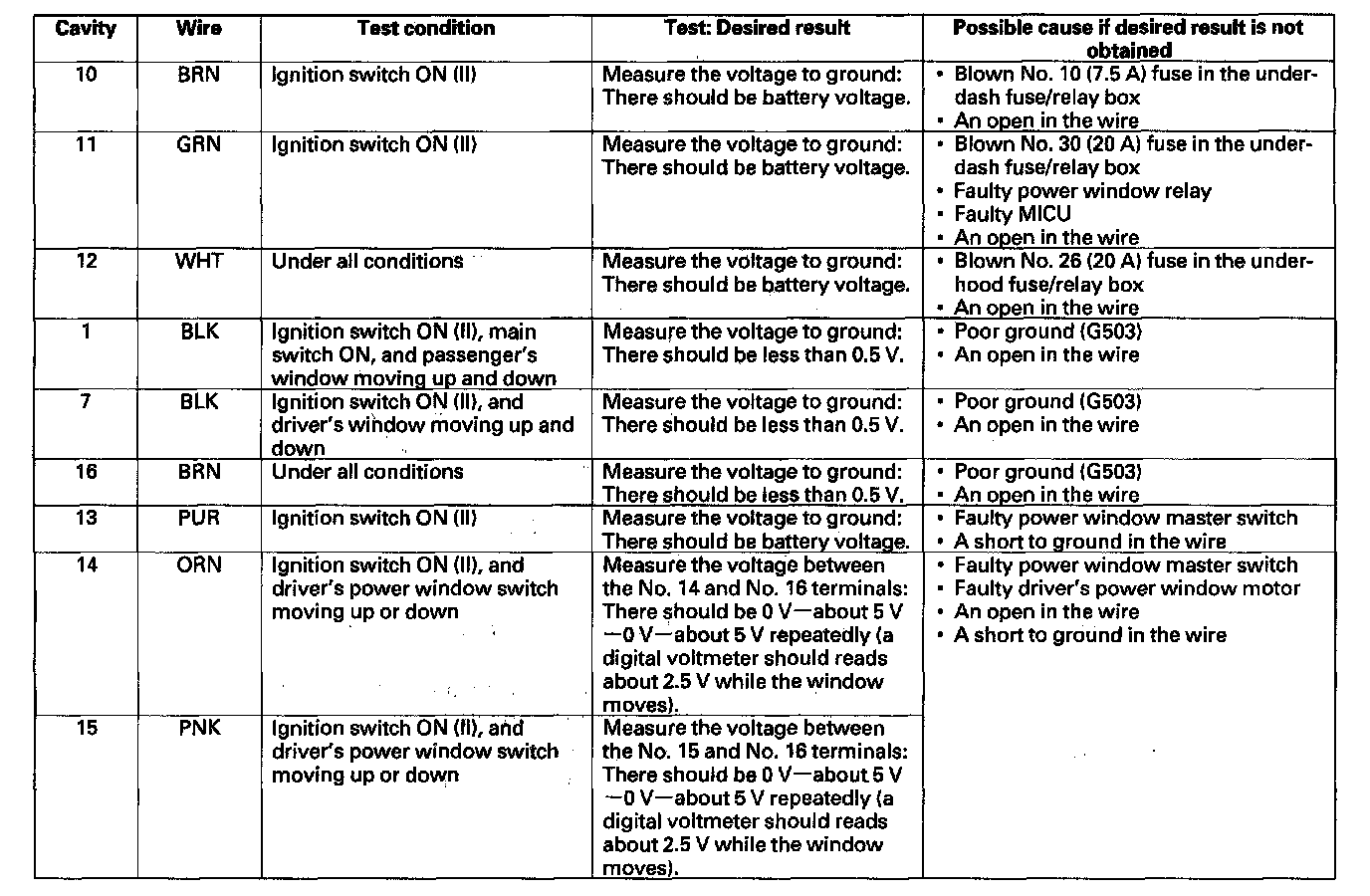 5. Reconnect the 16P connector to the power window master switch. Turn the ignition switch ON (II), and make these input tests at the connector.