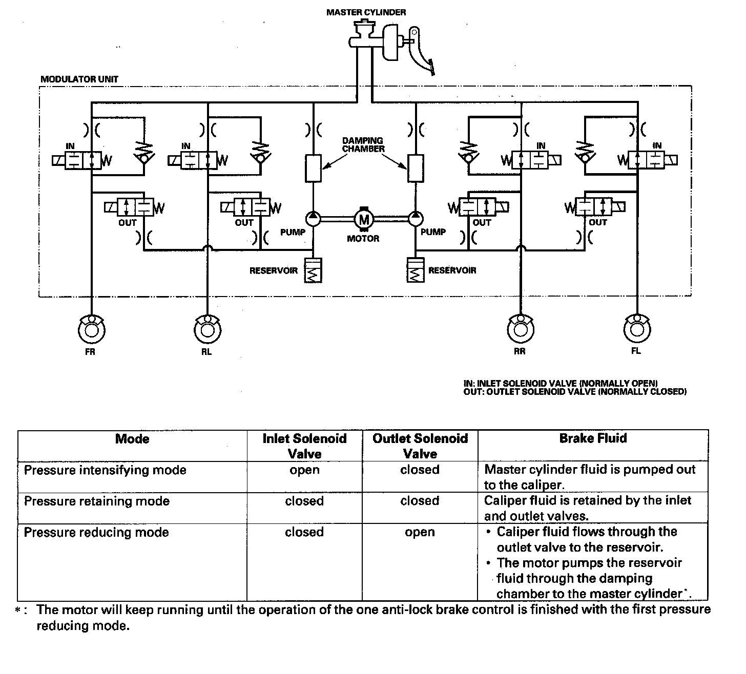 The ABS modulator consists of the inlet solenoid valve, the outlet solenoid valve, the reservoir, the pump, the pump motor, and the damping chamber. The modulator reduces the caliper fluid pressure directly. It is a circulating-type modulator because the brake fluid circulates through the caliper, the reservoir, and the master cylinder. The hydraulic control has three modes; pressure intensifying, pressure retaining, and pressure reducing. The hydraulic circuit is an independent four channel type; one channel for each wheel.