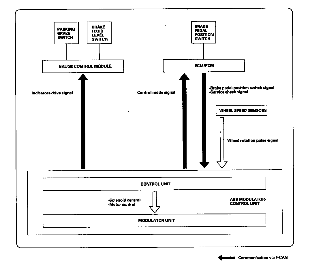 This system is composed of the ABS modulator-control unit, the wheel speed sensors, and the system indicators in the gauge control module. The ABS modulator-control unit controls the anti-lock brakes and the brake distribution functions.