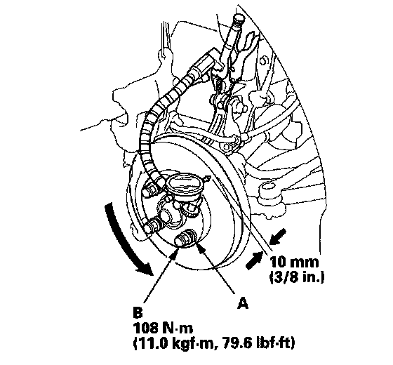 5. Install suitable flat washers (A) and wheel nuts (B), and tighten the wheel nuts to the specified torque to hold the brake disc securely against the hub.