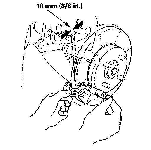 6. Set up the dial gauge against the brake disc as shown, and measure the runout at 10 mm (3/8 in.) from the outer edge of the brake disc.