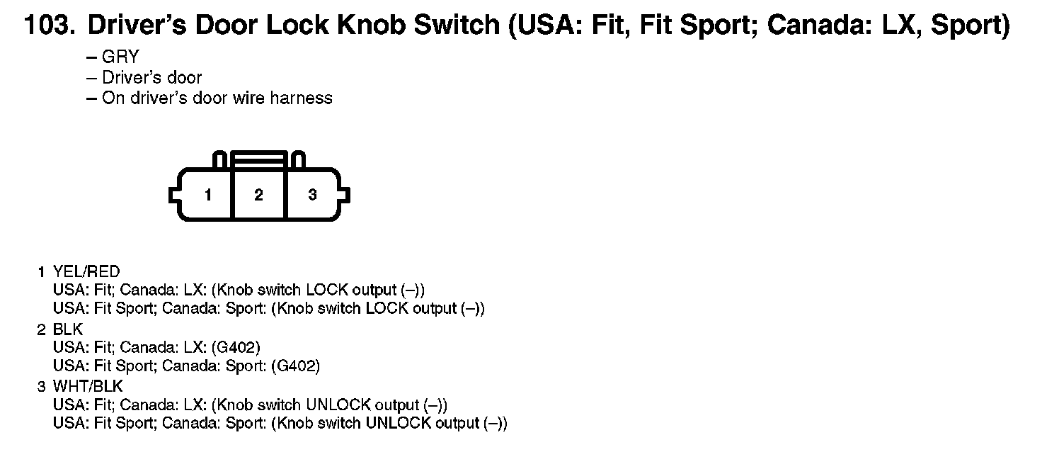 103. Driver's Door Lock Knob Switch (USA: Fit, Fit Sport; Canada: LX, Sport):