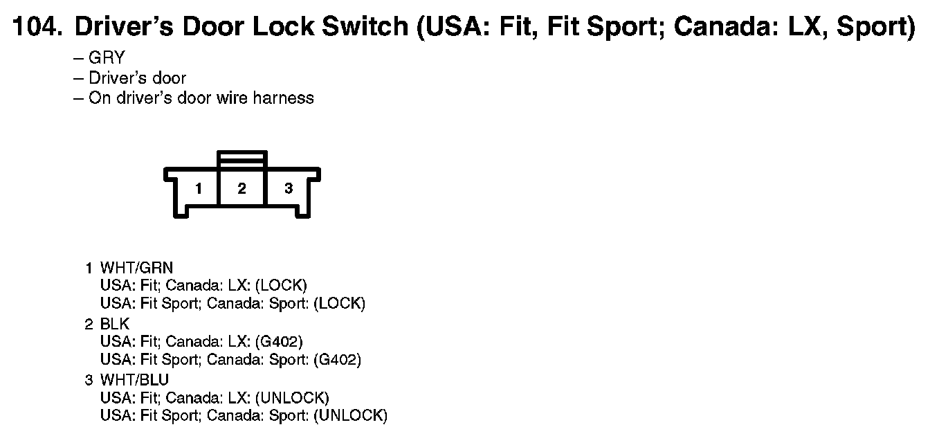 104. Driver's Door Lock Switch (USA: Fit, Fit Sport; Canada: LX, Sport):