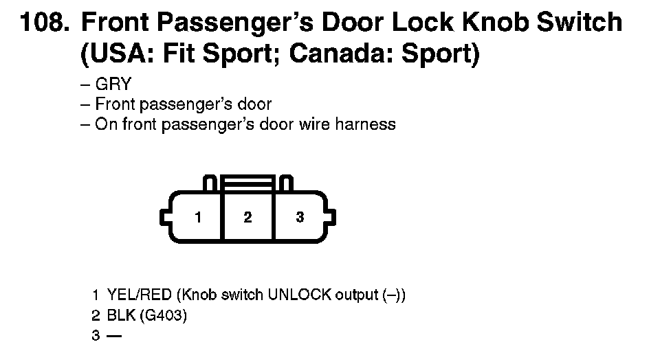 108. Front Passenger's Door Lock Knob Switch (USA: Fit Sport; Canada: Sport):