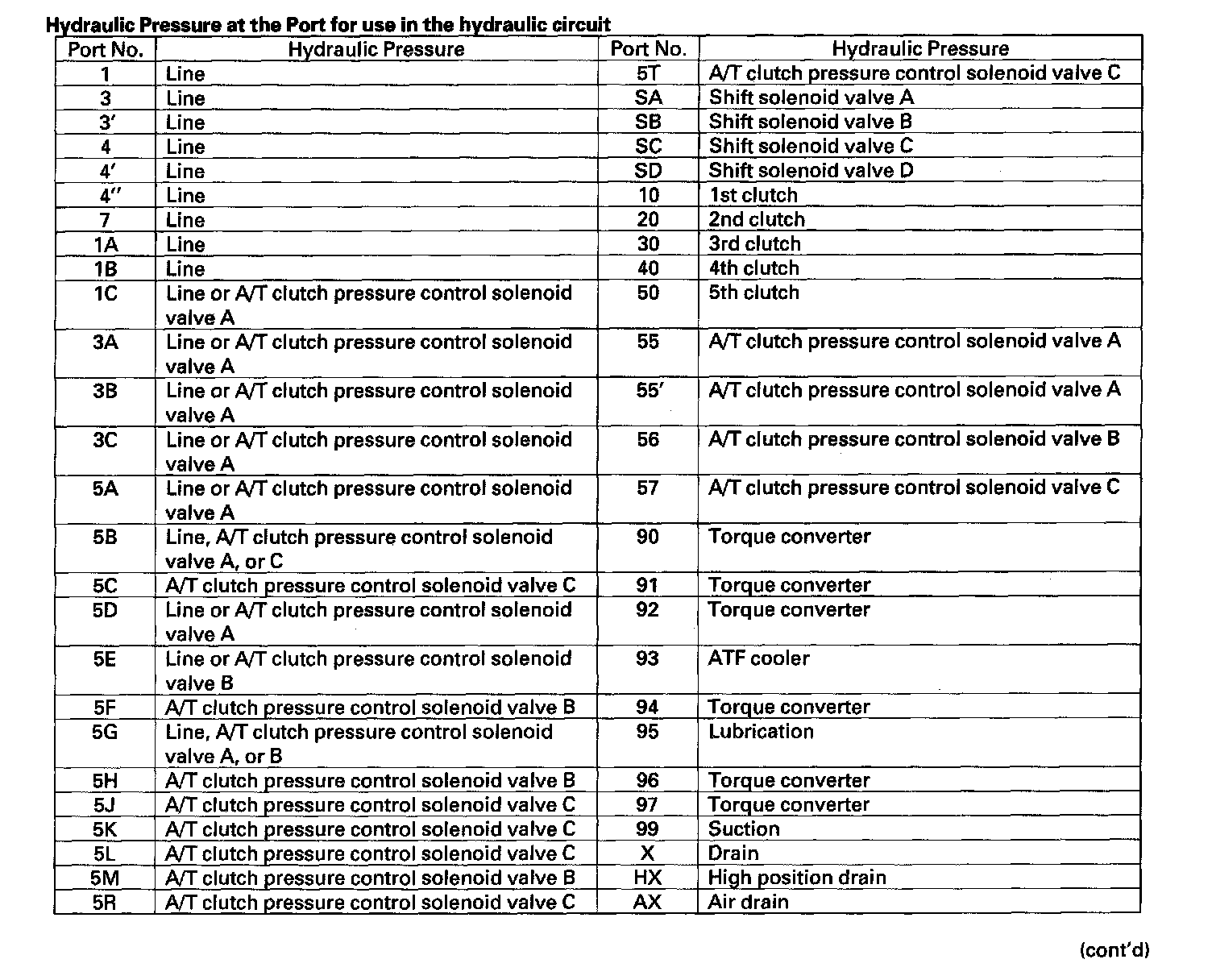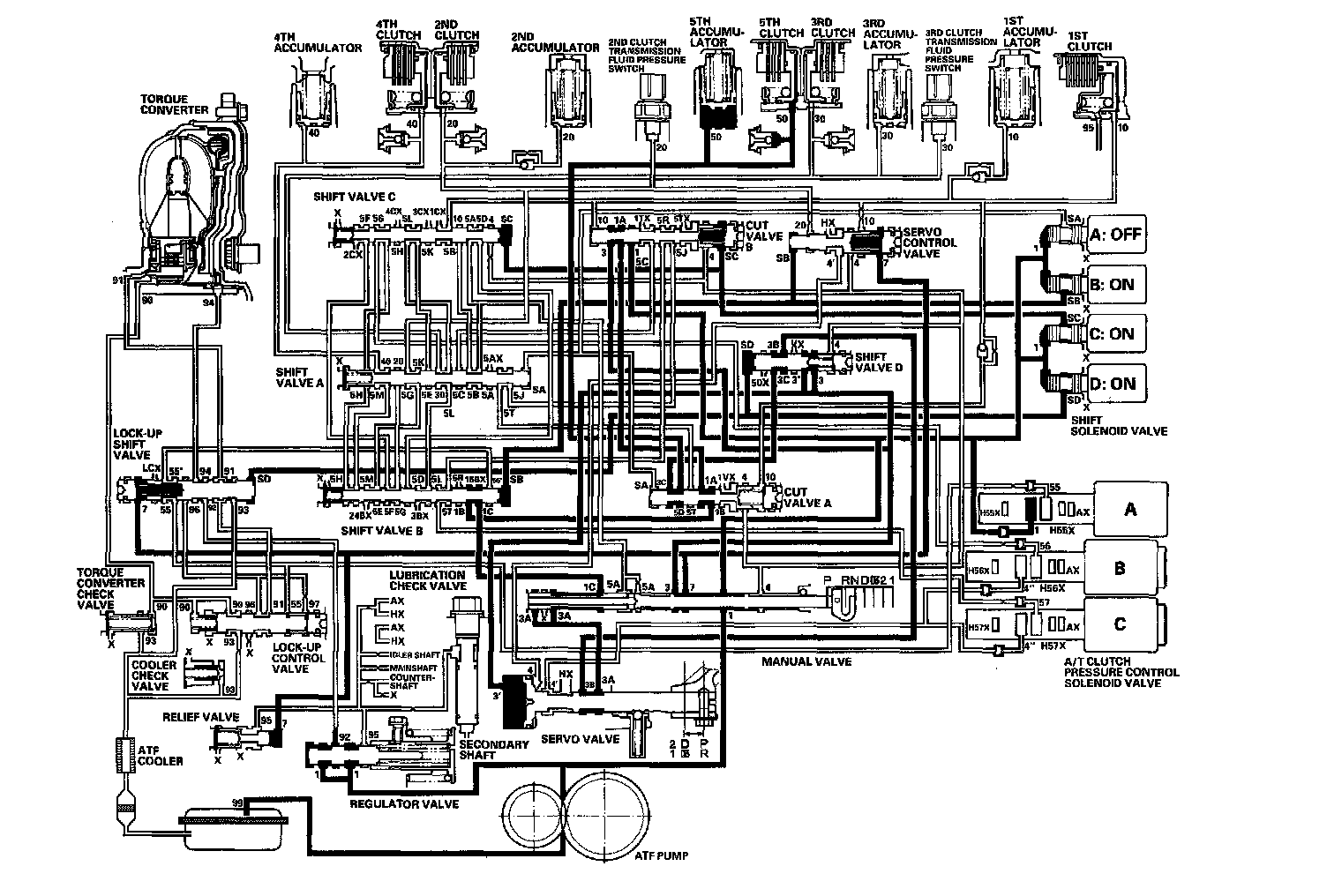 The PCM controls the shift solenoid valves ON and OFF. The shift solenoid valve blocks line pressure from the ATF pump via the manual valve when the shift solenoid valve is OFF. When the shift solenoid valve is turned ON by the PCM, line pressure changes to shift solenoid valve pressure at the shift solenoid valve, then the shift solenoid valve pressure flows to the shift valve. Applying shift solenoid pressure to the shift valve moves the position of the shift valve, and switches the port of the hydraulic circuit. The PCM also controls A/T clutch pressure control solenoid valves A, B, and C. The A/T clutch pressure control solenoid valves regulate hydraulic pressure, and apply pressure to the clutches to engage smoothly. The clutches receive optimum clutch pressure which is regulated by the A/T clutch pressure control solenoid valves for comfortable driving and shifting under all conditions.