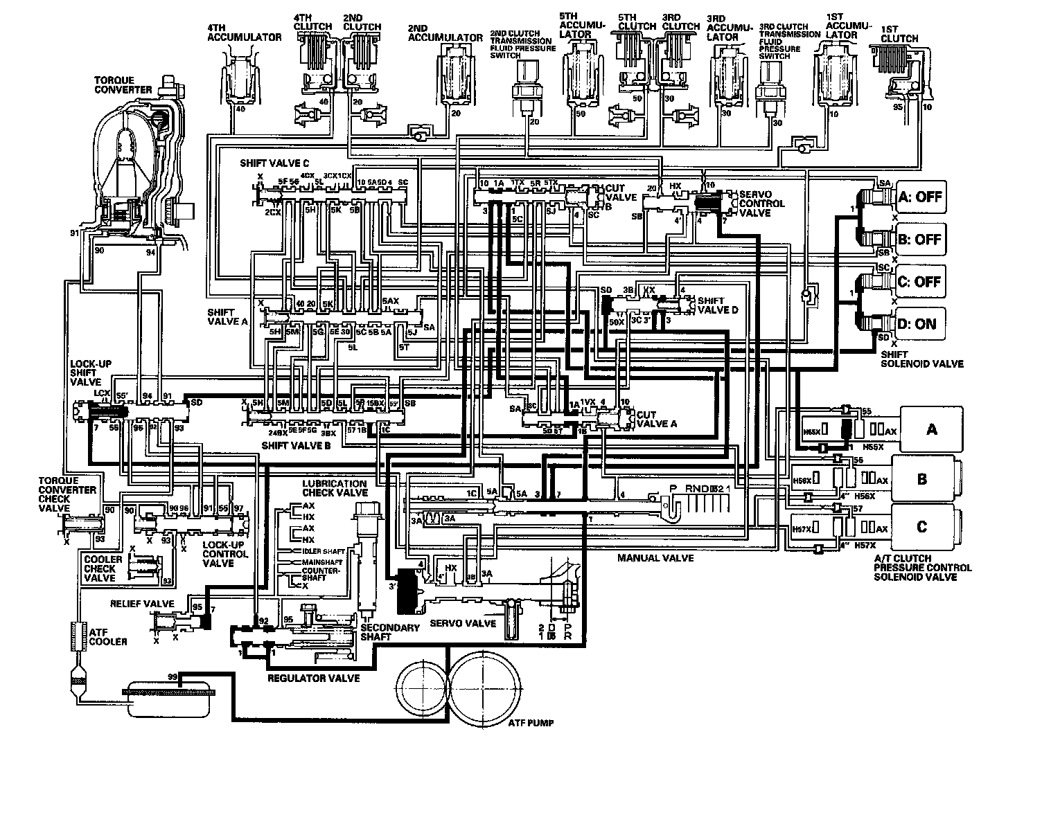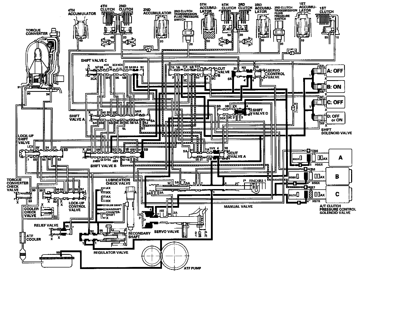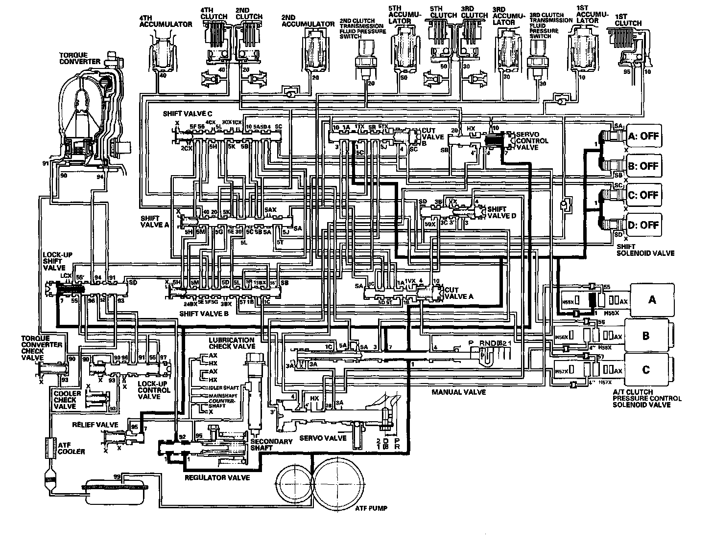 When shifting into R from P or N, line pressure (1) becomes line pressure (1), (3), and (7) at the manual valve. The PCM turns shift solenoid valve D ON, and shift solenoid valves A, B, and C OFF. Shift solenoid valve D pressure (SD) is applied to the left end of shift valve D, and shift valve D is moved to the right side to uncover the line pressure (3) port leading to the servo valve. Line pressure (3') from shift valve D flows to the servo valve, and pushes the servo valve to the reverse position. The PCM controls A/T clutch pressure control solenoid valve A to regulate A/T clutch pressure control solenoid valve A pressure (55), and A/T clutch pressure control solenoid valve A pressure (55) flows to the lock-up shift valve, shift valve B, the manual valve, the servo valve, shift valve D, and cut valve A. A/T clutch pressure control solenoid valve A pressure (3C) becomes 5th clutch pressure (50) at cut valve A. 5th clutch pressure (50) is applied to the 5th clutch, and the 5th clutch is engaged with the A/T clutch pressure control solenoid valve A pressure mode.