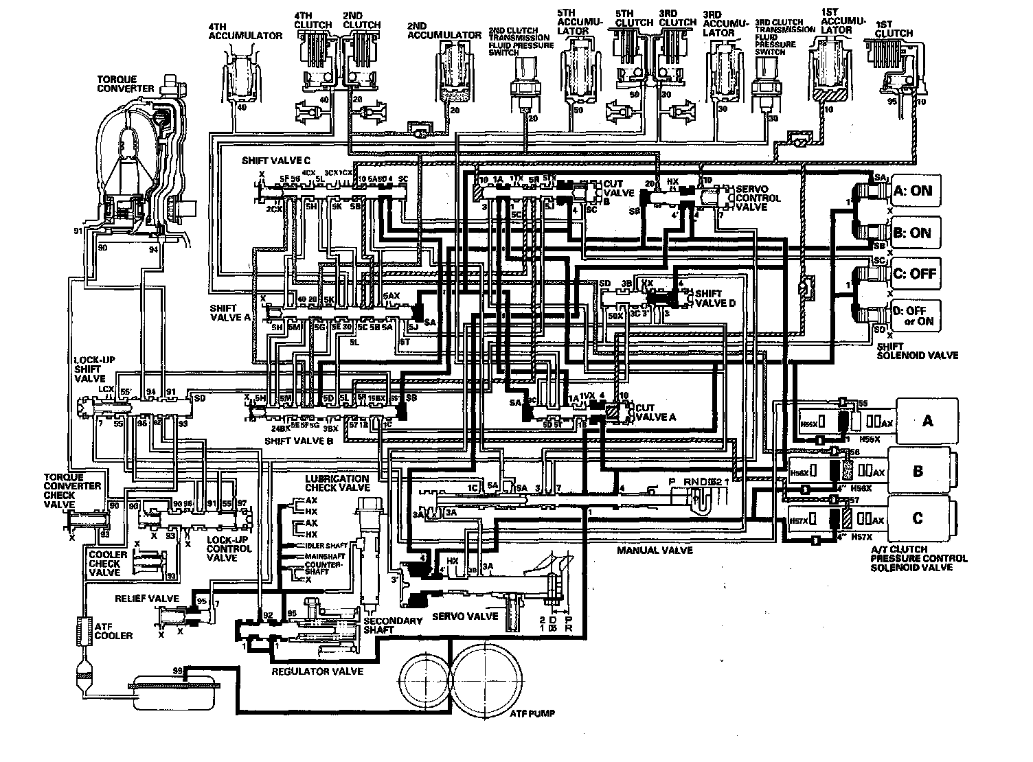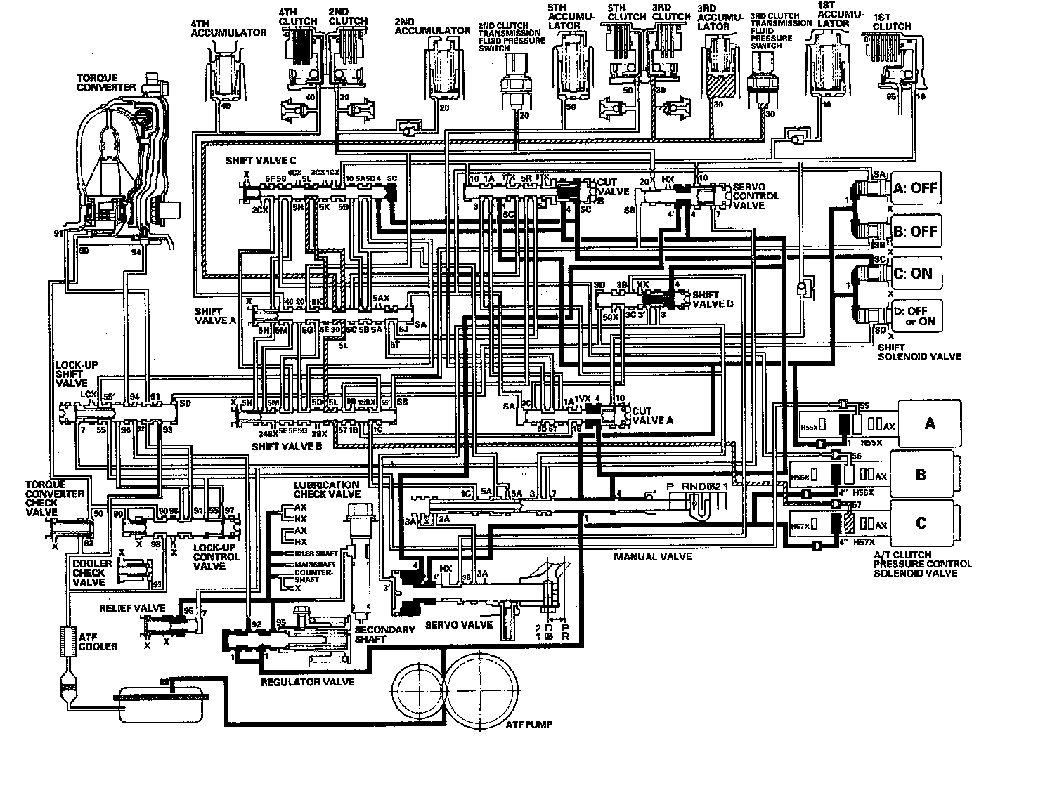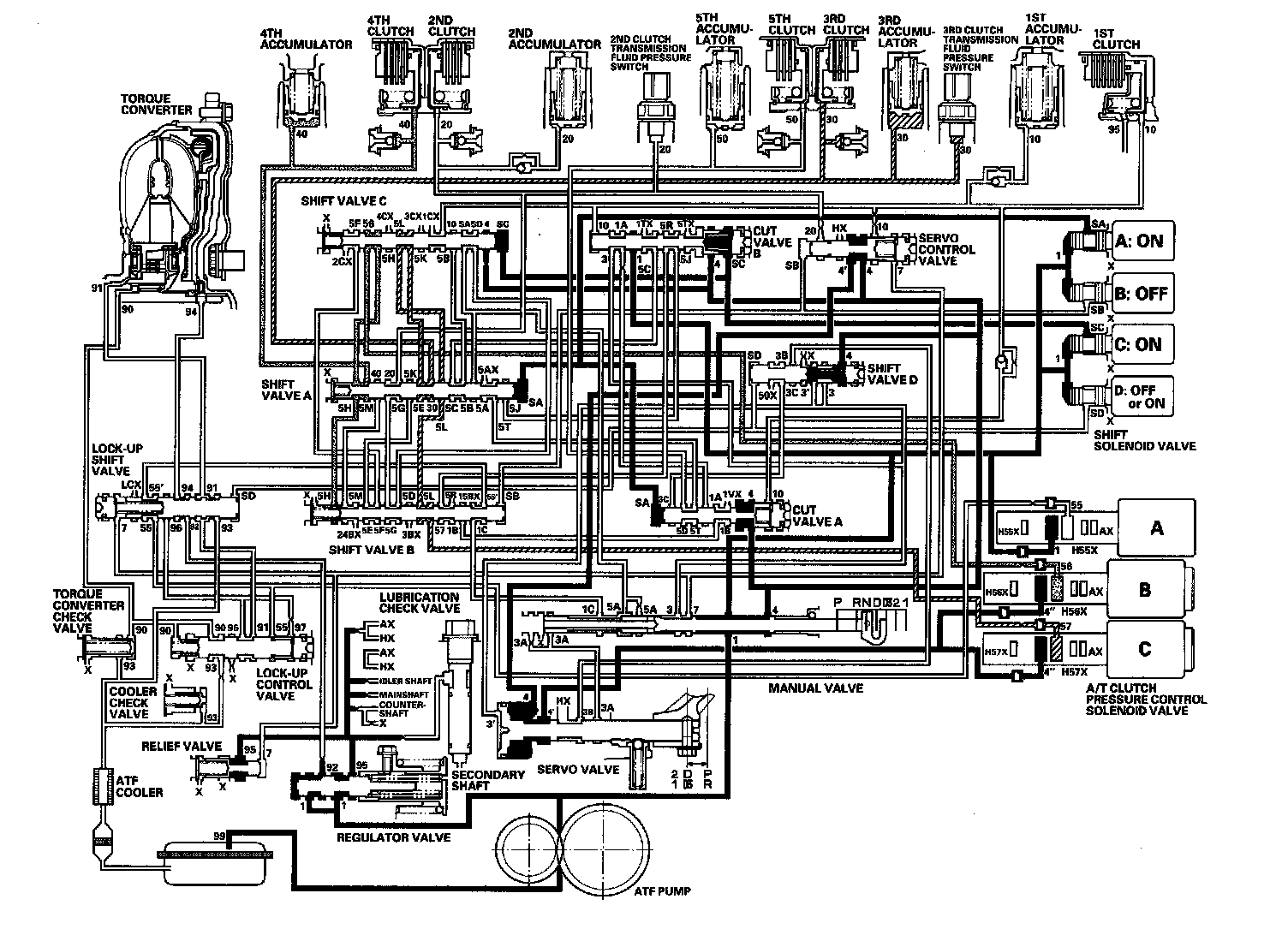 When shifting into R from P or N, line pressure (1) becomes line pressure (1), (3), and (7) at the manual valve. The PCM turns shift solenoid valve D ON, and shift solenoid valves A, B, and C OFF. Shift solenoid valve D pressure (SD) is applied to the left end of shift valve D, and shift valve D is moved to the right side to uncover the line pressure (3) port leading to the servo valve. Line pressure (3') from shift valve D flows to the servo valve, and pushes the servo valve to the reverse position. The PCM controls A/T clutch pressure control solenoid valve A to regulate A/T clutch pressure control solenoid valve A pressure (55), and A/T clutch pressure control solenoid valve A pressure (55) flows to the lock-up shift valve, shift valve B, the manual valve, the servo valve, shift valve D, and cut valve A. A/T clutch pressure control solenoid valve A pressure (3C) becomes 5th clutch pressure (50) at cut valve A. 5th clutch pressure (50) is applied to the 5th clutch, and the 5th clutch is engaged with the A/T clutch pressure control solenoid valve A pressure mode.