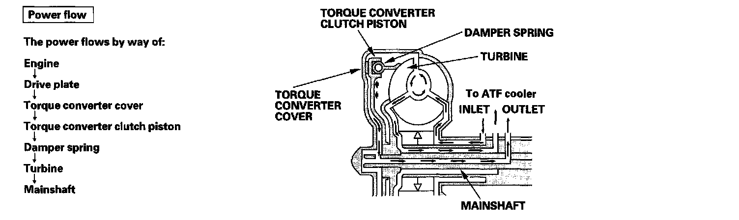 Lock-up SystemThe lock-up mechanism of the torque converter clutch operates in all five gears. The pressurized fluid is drained from the back of the torque converter through a fluid passage, causing the torque converter clutch piston to be held against the torque converter cover. As this takes place, the mainshaft rotates at the same speed as the engine crankshaft. Together with the hydraulic control, the PCM optimizes the timing and amount of the lock-up mechanism. When shift solenoid valve D is turned ON by the PCM, shift solenoid valve D pressure switches the lock-up shift valve lock-up ON and OFF. A/T clutch pressure control solenoid valve A and the lock-up control valve control the amount of lock-up.