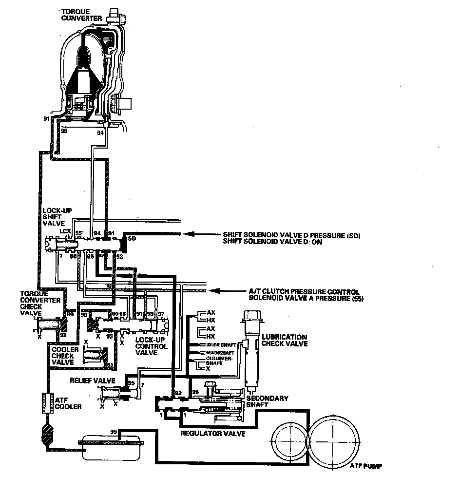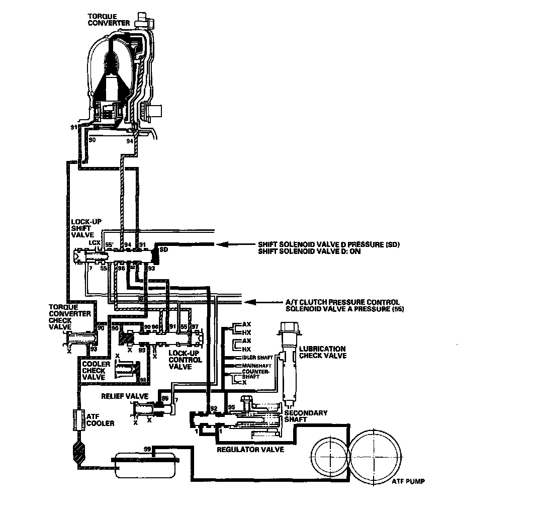 As the speed of the vehicle reaches the programmed value, the PCM turns shift solenoid valve D ON. Shift solenoid valve D pressure (SD) is applied to the right end of the lock-up shift valve to switch the torque converter pressure port leading to the front of the torque converter. Torque converter pressure (91) enters into the front of the torque converter to engage the torque converter clutch piston. The PCM also controls A/T clutch pressure control solenoid valve A to regulate A/T clutch pressure control solenoid valve A pressure (55), and A/T clutch pressure control solenoid valve A pressure (55) is applied to the lock-up control valve. Torque converter pressure (94) drained from the back of the torque converter is applied to the right side of the lock-up control valve, and torque converter pressure (90) is applied to the left side of the lock-up control valve. The lock-up control valve controls the amount of the lock-up by receiving these pressures. The torque converter clutch is engaged partially when torque converter pressure (90) in the left side of the lock-up control valve is higher, and the torque converter clutch is engaged securely according to the amount of pressure in the right side of the lock-up control valve. Under this condition, the torque converter clutch is engaged by pressure entering into the front side of the torque converter; this condition is partial lock-up.