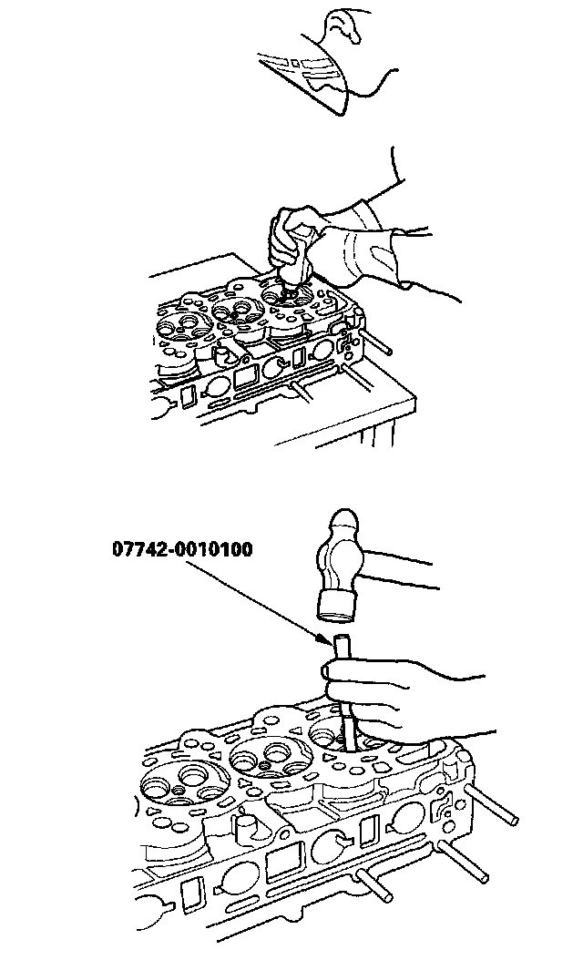 5. Working from the camshaft side, use the valve guide driver and an air hammer to drive the guide about 2 mm (0.1 in.) towards the combustion chamber. This will knock off some of the carbon and make removal easier. Hold the air hammer directly in line with the valve guide to prevent damaging the driver.
