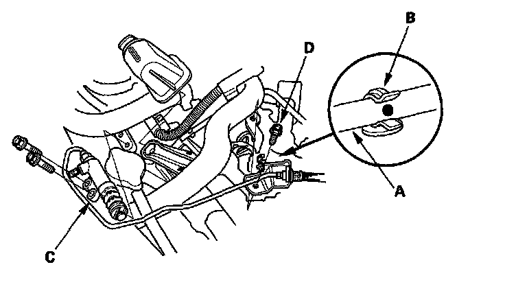 18. M/T model: Remove the breather tube (A) from the clamp (B), clutch slave cylinder (C) and clutch line bracket mounting bolt (D). Do not operate the clutch pedal once the slave cylinder has been removed.