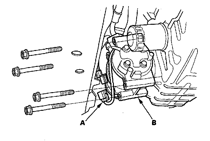 31. With A/C: Disconnect the A/C compressor clutch connector (A), then remove the A/C compressor (B) without disconnecting the A/C hoses.