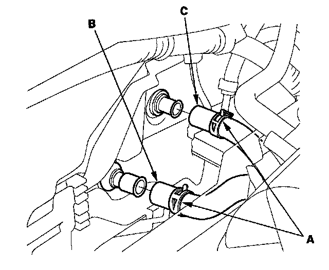 5. Slide the hose clamps (A) back, then disconnect the inlet heater hose (B) and the outlet heater hose (C) from the heater core. Engine coolant will run out when the hoses are disconnected; drain it into a clean drip pan. Be sure not to let coolant spill on the electrical parts or the painted surfaces. If any coolant spills, rinse it off immediately.