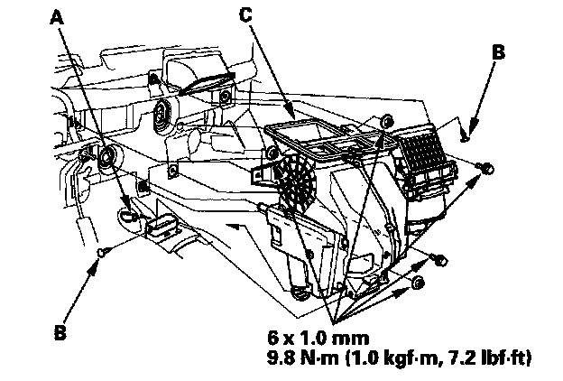 7. Disconnect the drain hose (A) with air conditioning. Remove the clips (B), the mounting bolts, the mounting nuts, and the blower-heater unit (C).