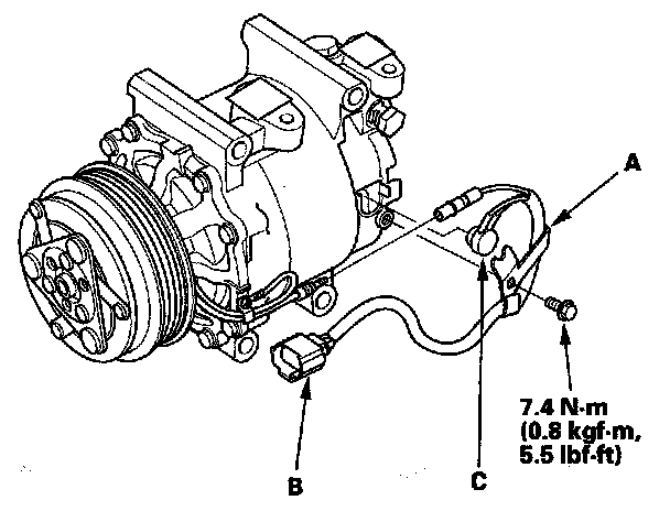 A/C Compressor Thermal Protector Replacement1. Remove the bolt and the holder (A). Disconnect the field coil connector (B), then remove the thermal protector (C).