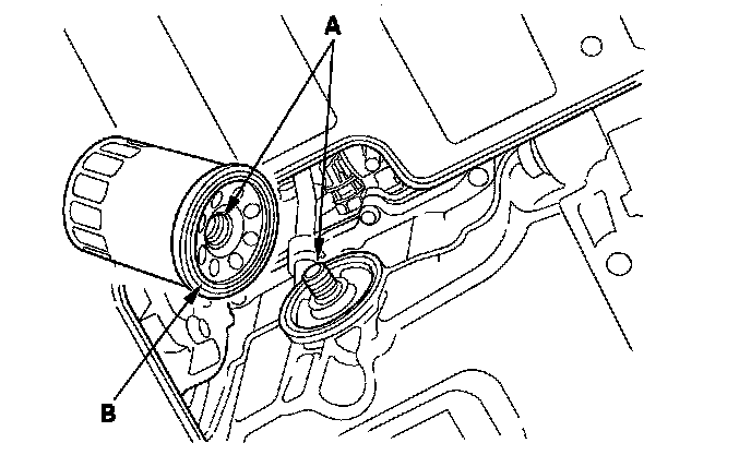 3. Inspect the threads (A) and rubber seal (B) on the new filter. Wipe off the seat on the oil pan, then apply a light coat of oil to the new filter rubber seal. Use only filters with a built-in bypass system.