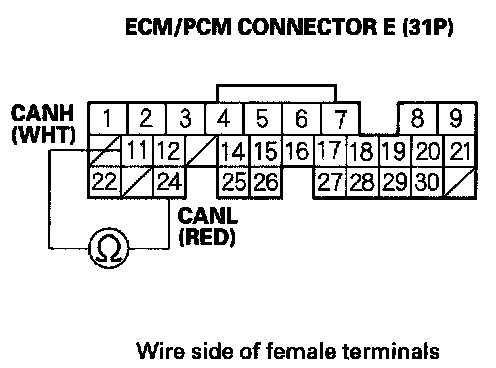 21. Measure resistance between ECM/PCM connector terminals E11 and E24.