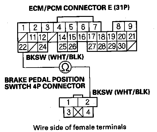 9. Check for continuity between ECM/PCM connector terminal E22 and brake pedal position switch 4P connector terminal No. 2.