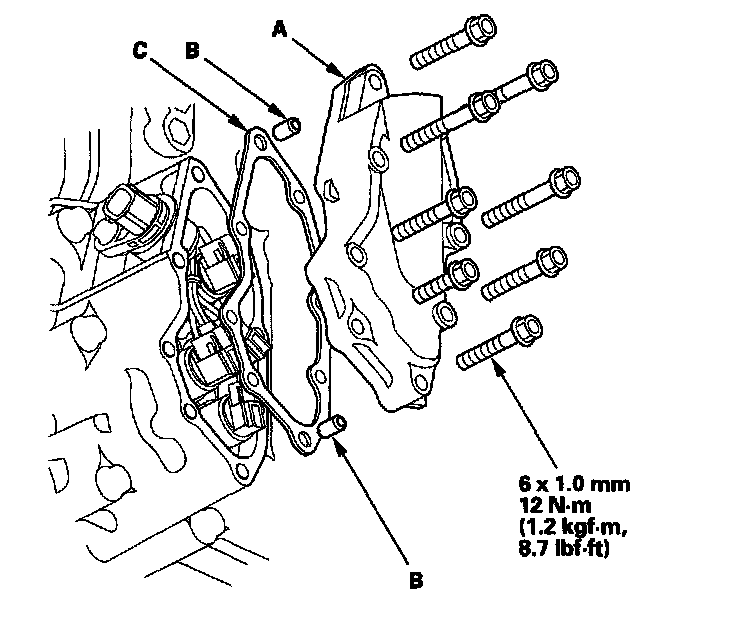 8. Remove the shift solenoid valve cover (A), dowel pins (B), and gasket (C).