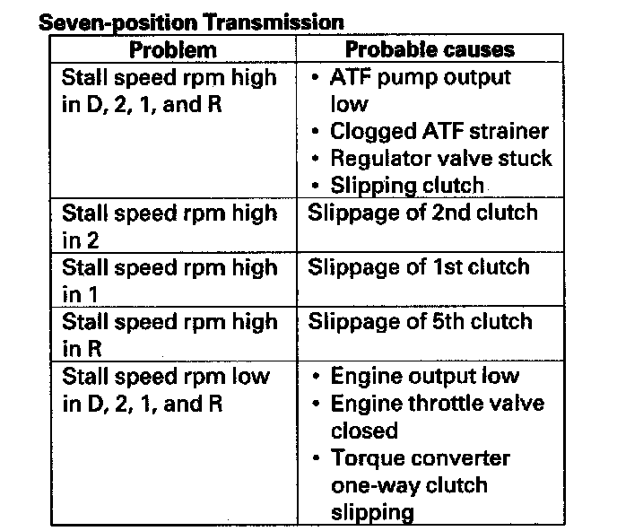 9. If the stall speed measurements are out of the service limit, refer to the problems and probable causes listed in the table.