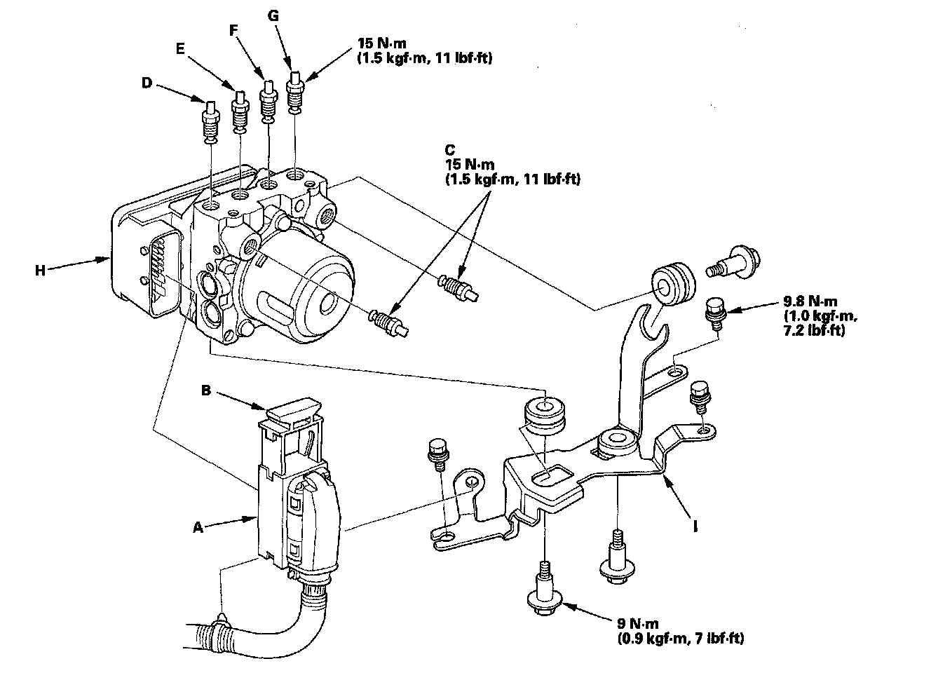 4. Remove the ABS modulator-control unit (H) with the brackets (I) from the body.