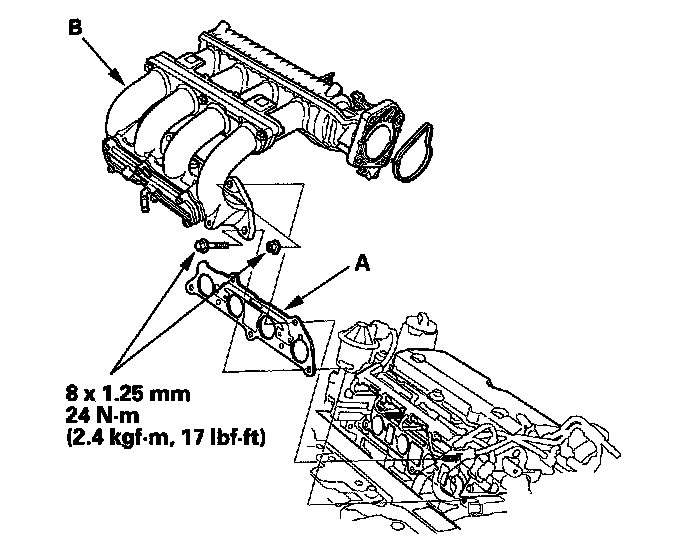 Install the intake manifold (B) and tighten the bolts and nuts in a crisscross pattern in three steps, beginning with the inner bolt.