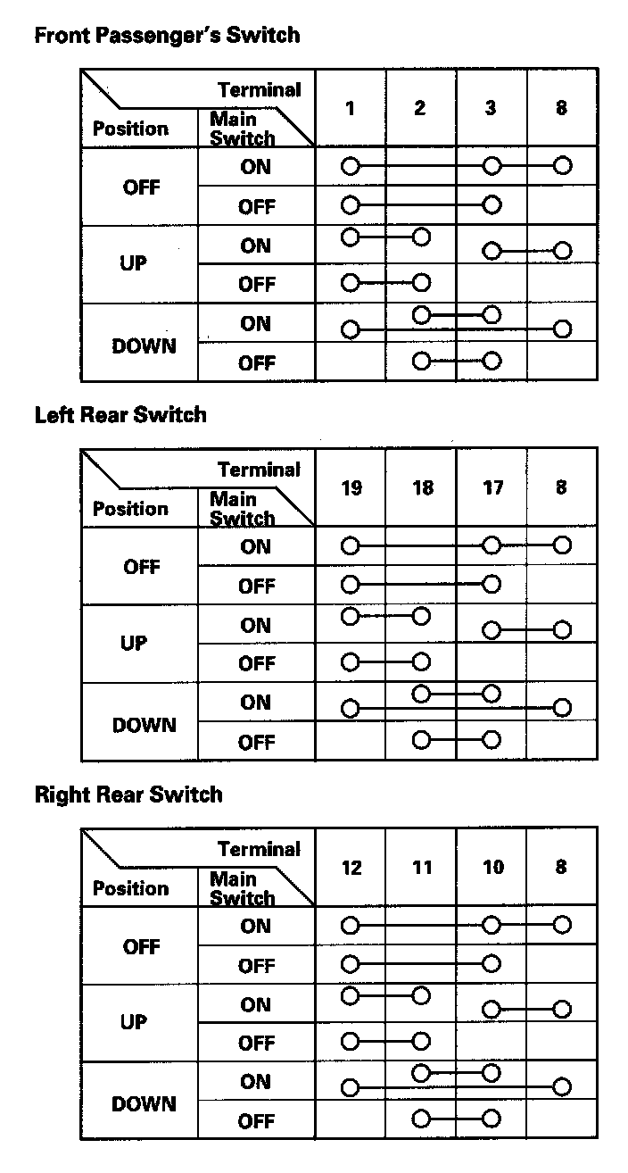 3. Check for continuity between the terminals in each switch position according to the tables.
