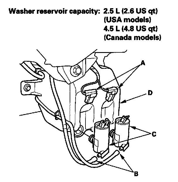 5. Install the reservoir in the reverse order of removal. Check the washer motor operation.