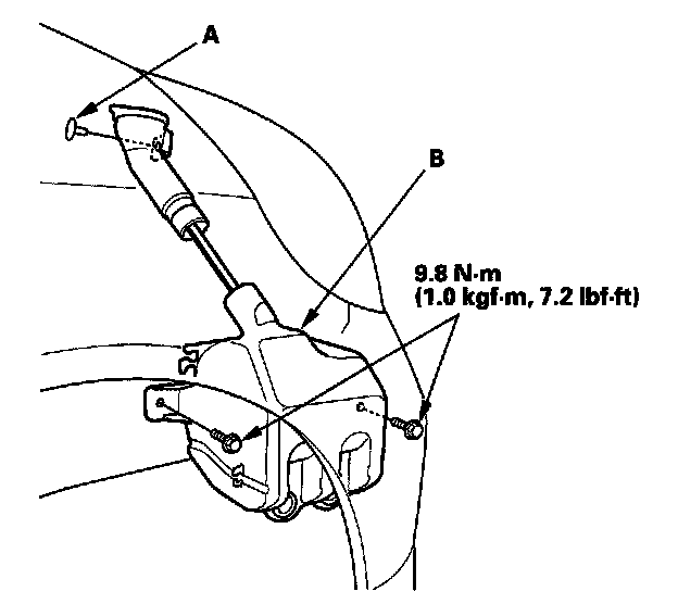 4. Remove the two bolts and clip (A), then remove the washer reservoir (B).