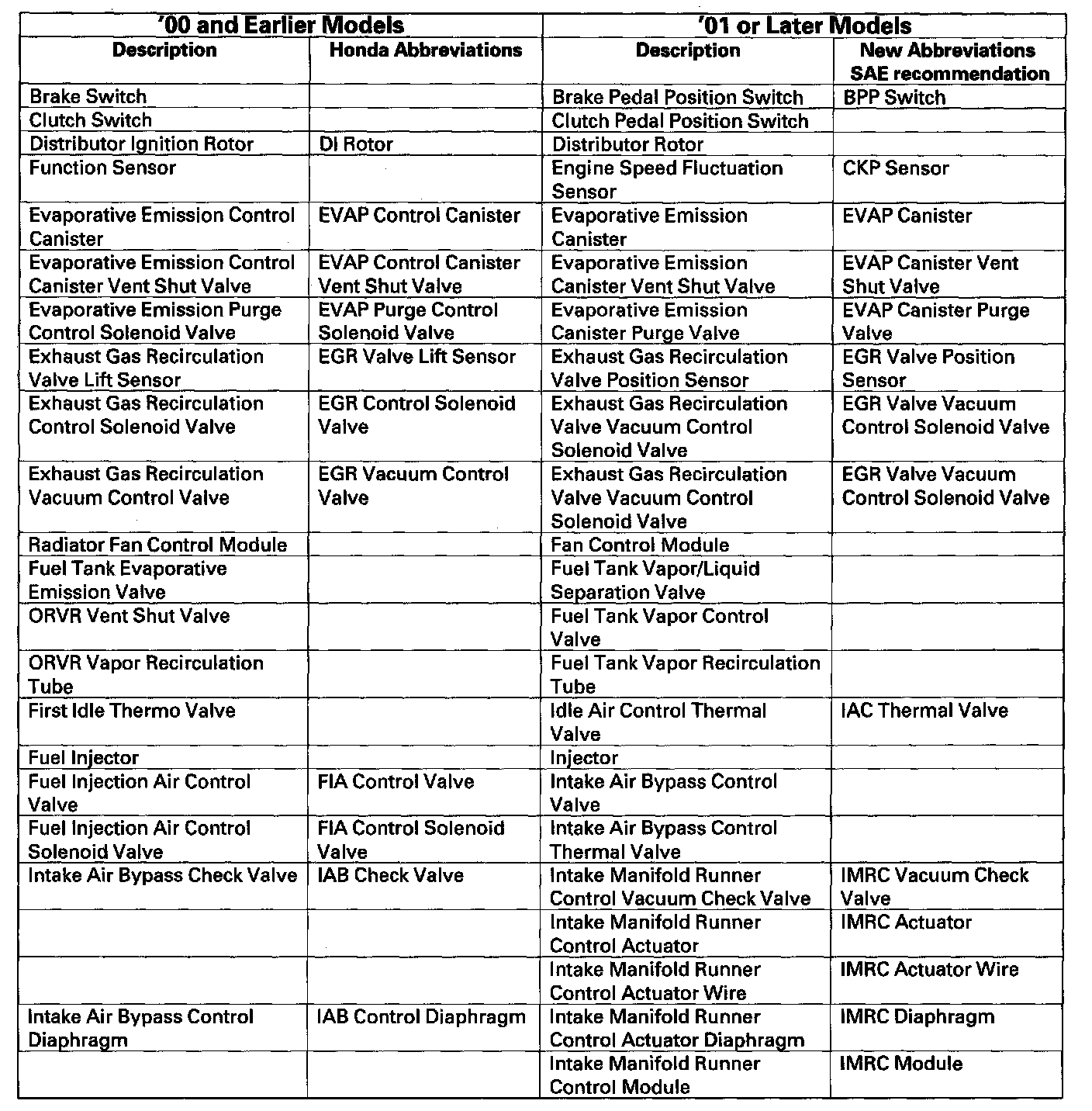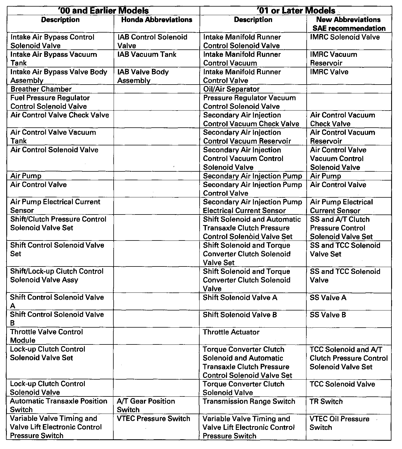 Revised Component TermsBeginning with '01 model, the following component terms have been changed to conform with the standards in SAE document J1930. If you find a term or abbreviation in an '01 or later manual that is unfamiliar to you, check this list. If a term is not listed below, it did not change.