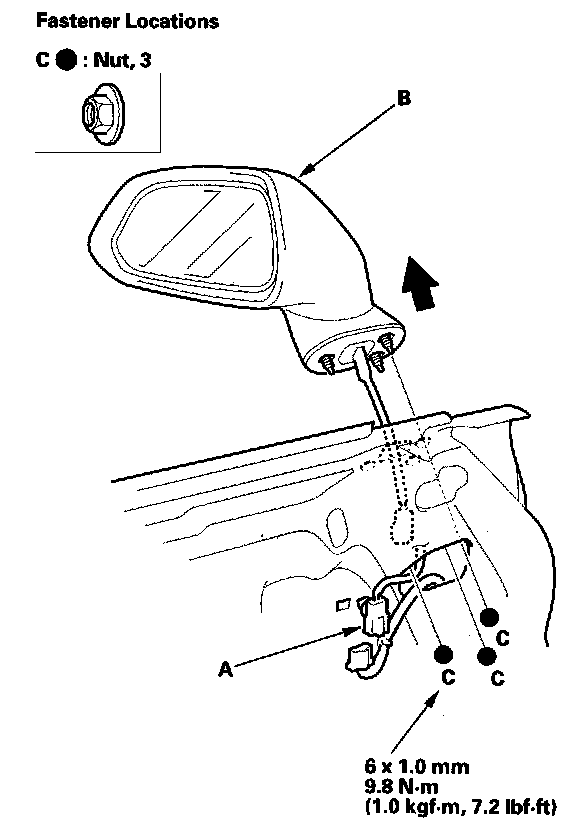 3. Support the mirror (B) with one hand, remove the nuts (C), then remove the mirror.
