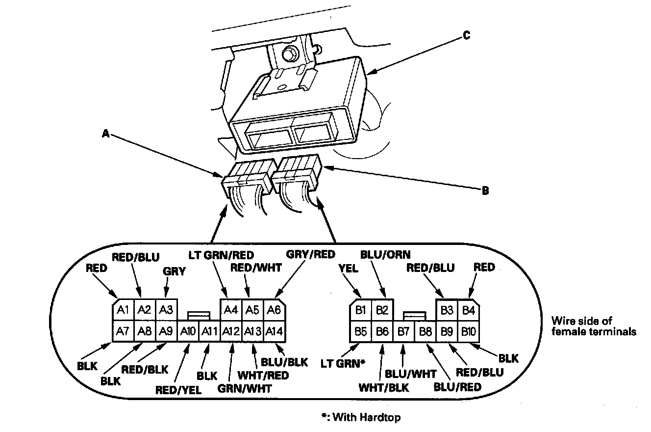 2. Disconnect the 14P connector (A) and 10P connector (B) from the convertible top control unit (C).