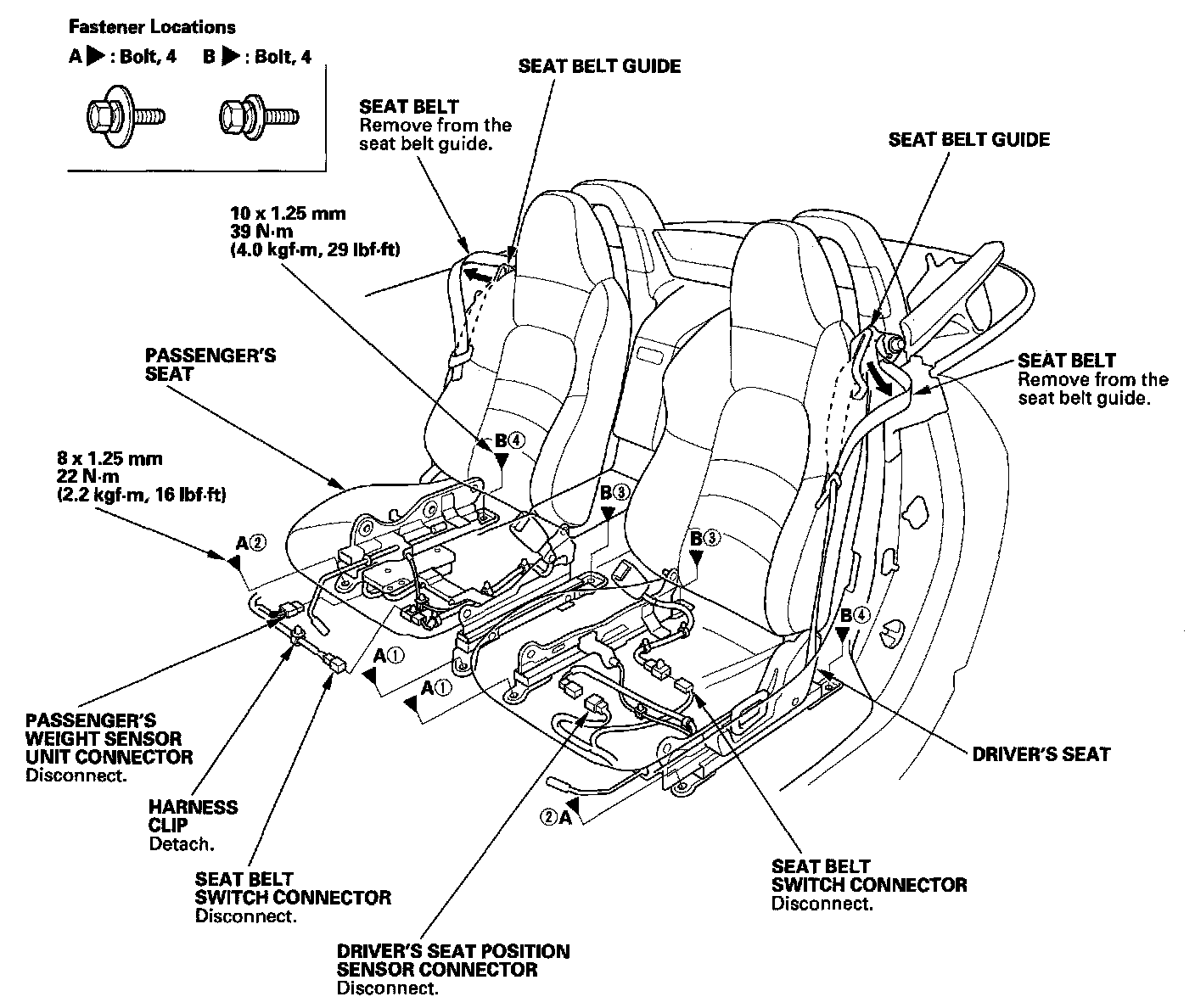 - Tighten the seat mounting bolts to the specified torque in the sequence shown. Slide the seat all the way back and tighten (1) and (2), then slide it forward and tighten (3) and (4). The driver's seat is shown; the passenger's seat is similar.