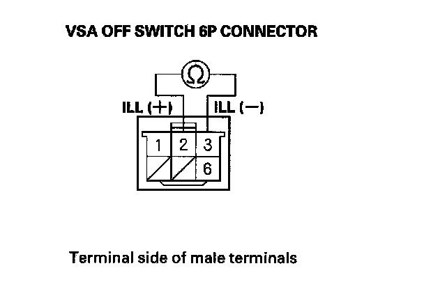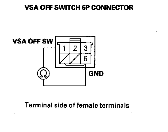 4. Check for continuity between VSA OFF switch 6P connector terminals No. 2 and No. 3. There should be continuity at all times.