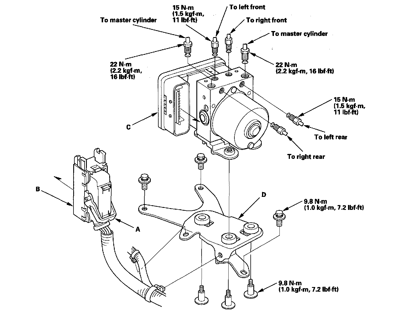 4. Remove the VSA modulator-control unit with the bracket (D) from the body.