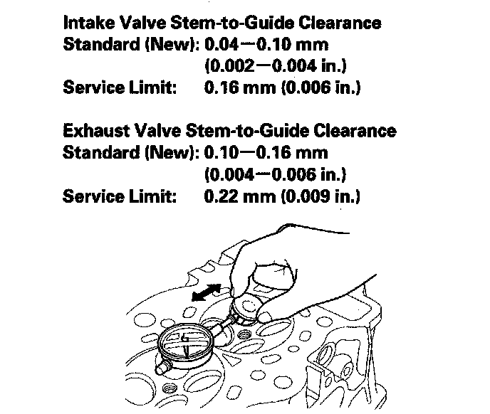 3. Subtract the O.D. of the valve stem, measured with a micrometer, from the I.D. of the valve guide, measured with an inside micrometer or ball gauge. Take the measurements in three places along the valve stem and three places inside the valve guide. The difference between the largest guide measurement and the smallest stem measurement should not exceed the service limit.