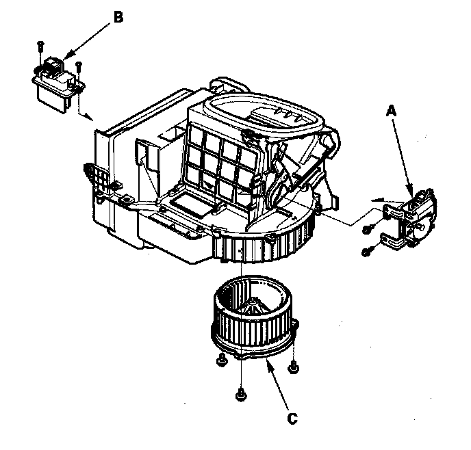 - The recirculation control motor (A), the power transistor (B) and the blower motor (C) can be replaced without removing the blower unit.