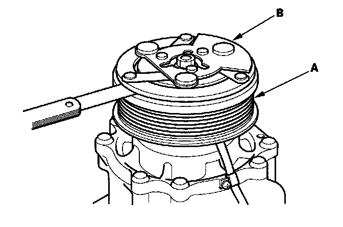 3. Measure the clearance between the rotor pulley (A) and the armature plate (B) all the way around. If the clearance is not within specified limits, remove the armature plate and add or remove shims as needed to increase or decrease clearance.