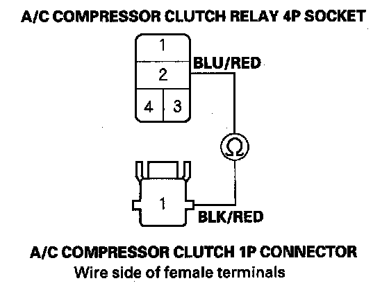16. Check for continuity between the No. 2 terminal of the A/C compressor clutch relay 4P socket and the No. 1 terminal of the A/C compressor clutch 1P connector.