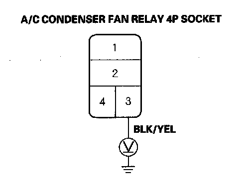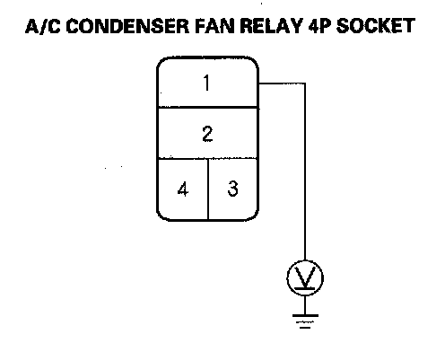 3. Measure the voltage between the No. 1 terminal of the A/C condenser fan relay 4P socket and body ground.