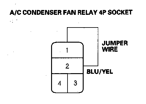 4. Connect the No. 1 and No. 2 terminals of the A/C condenser fan relay 4P socket with a jumper wire.
