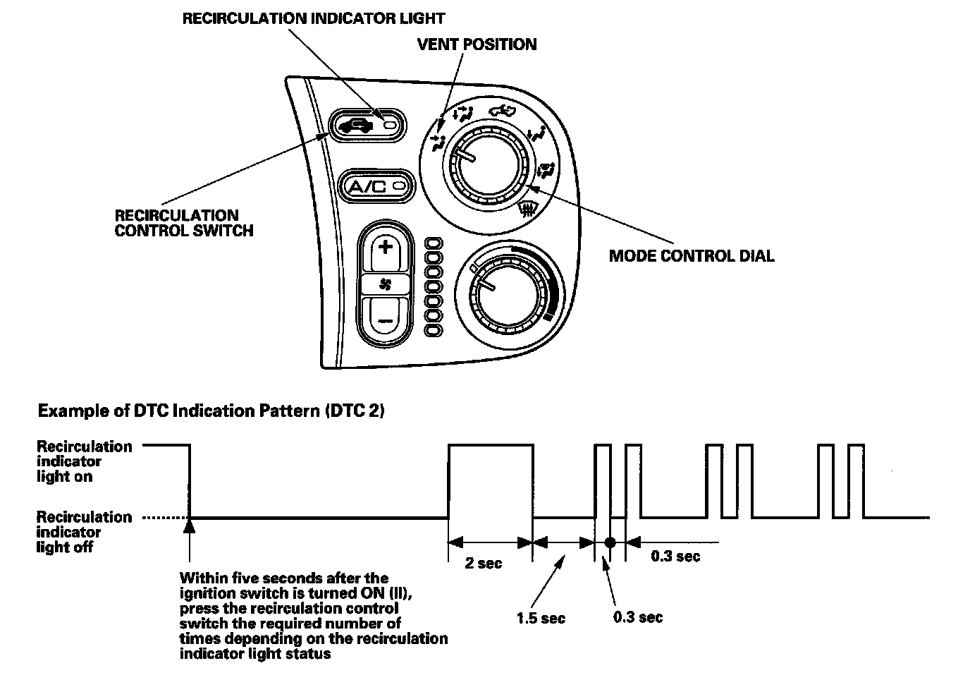 The recirculation indicator will come on for 2 seconds, then blink the Diagnostic Trouble Code (DTC) to indicate a faulty component. If no DTCs are found, the indicator will not blink after the initial 2 seconds light.
