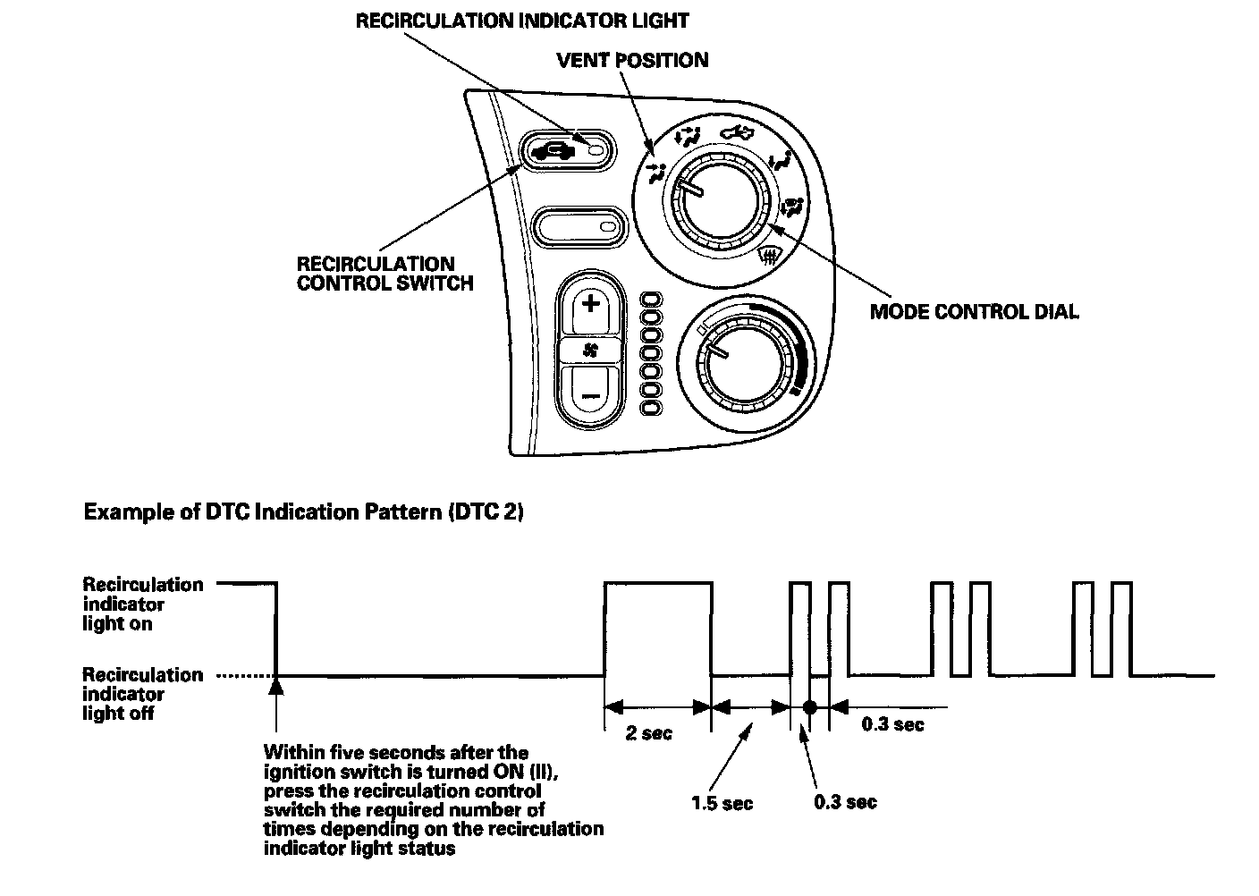 The recirculation indicator will come on for 2 seconds, then blink the Diagnostic Trouble Code (DTC) to indicate a faulty component. If no DTCs are found, the indicator will not blink after the initial 2 seconds light.