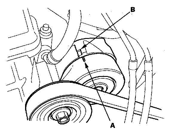 2. Check that the indicator (A) on the auto-tensioner housing is not beyond the edge of the indicator rib (B) on the tensioner base. If it is beyond the edge of the indicator rib, replace the drive belt.