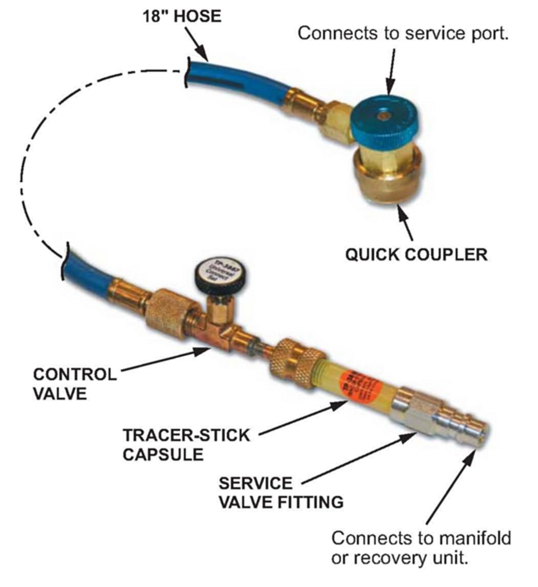* ^ If you have recovered refrigerant to weigh it as part of your diagnostics, or if there is a low charge, it is more efficient to recharge the system using normal procedures before installing the universal connect set. Dye can then be added using approximately 0.05 lb (0.02 kg) of refrigerant.*
