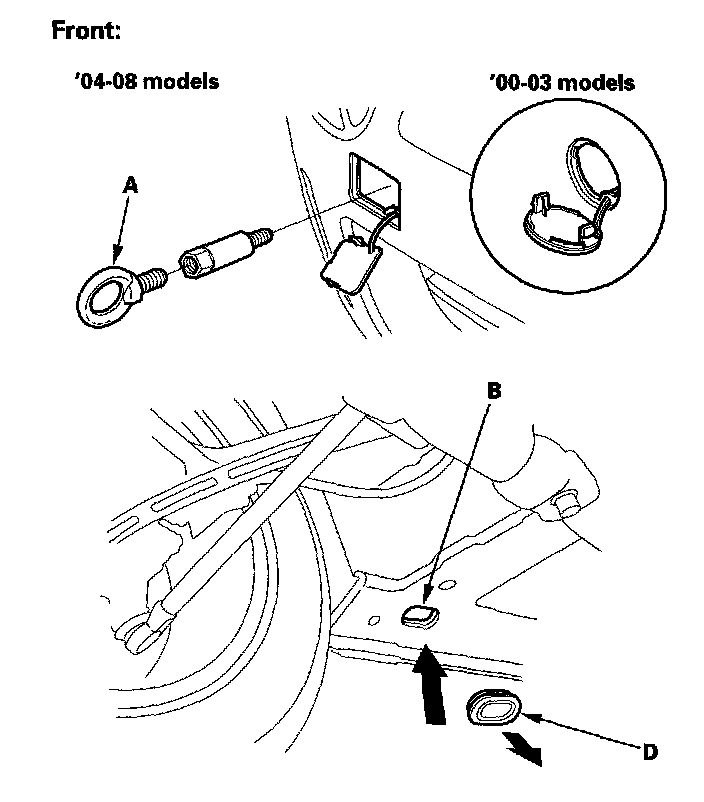 - The tow hook should not be used to tow the vehicle onto a flat-bed. Do not use it as a tie down.