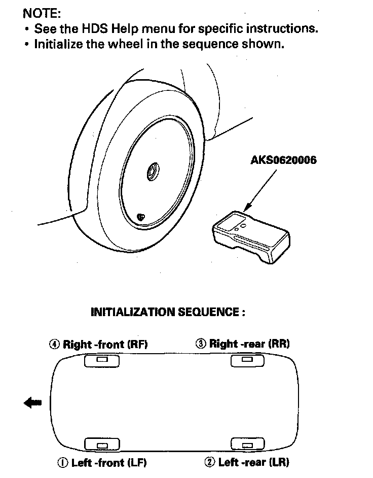 6. Follow the prompts on the HDS to activate the tire pressure sensors using the TPMS sensor initializer tool. Start with the left-front (LF) wheel.