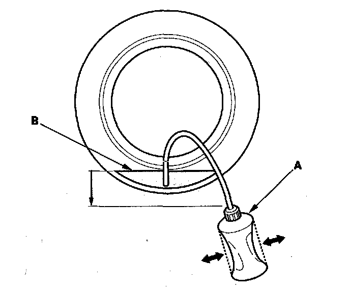 5. Use a commercially available squeeze bottle, siphon gun (A), a commercially available air, or hand vacuum tool with a proper tube to remove the tire sealant. Insert the tube into the tire through the valve stem hole, and stick it down until the end of the tube is immersed into the sealant (B).