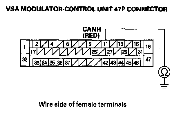 14. Check for continuity between VSA modulator-control unit 47P connector terminal No. 15 and body ground.