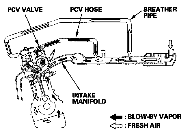 The PCV valve prevents blow-by gases from escaping into the atmosphere by venting them into the intake manifold.